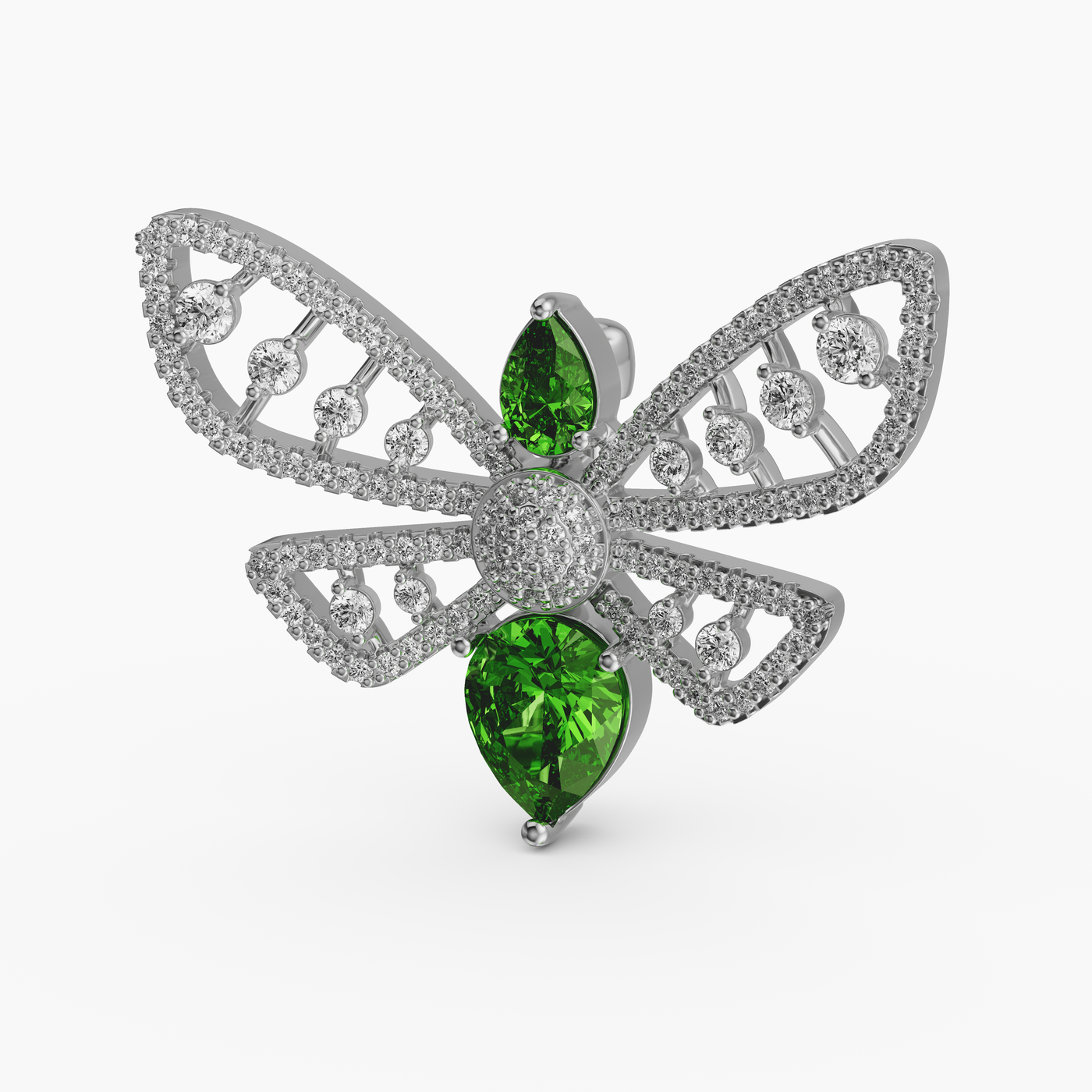 The body of the moth/bee is defined by two magnificent, pear-cut Emerald Green CZ stones—one small and one large—providing a luxurious depth and dramatic contrast to the clear stones. The intricate design and superior brilliance make this brooch a perfect statement piece, adding a touch of bold elegance to a jacket, scarf, or dress.