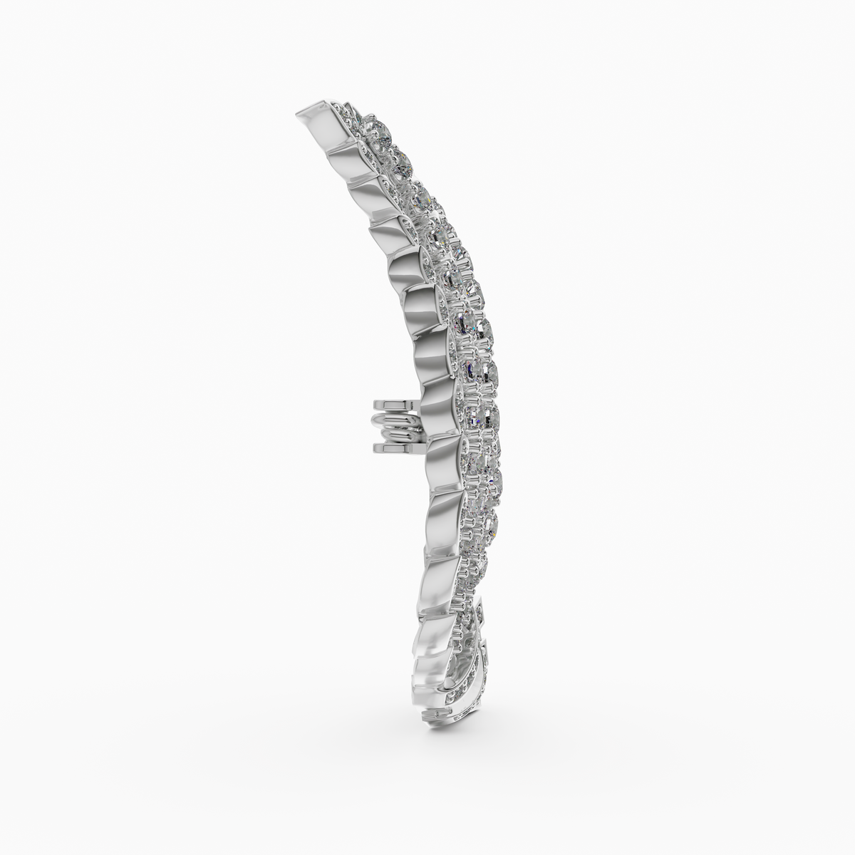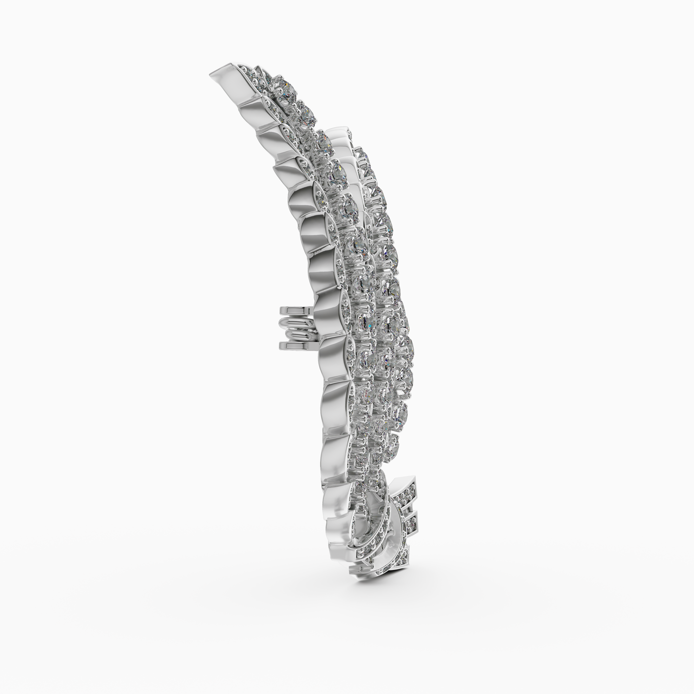 Inspired by movement and myth, this spectacular jewel captures the powerful sweep of a phoenix's wing or a cascade of flourishing petals. The design is meticulously set with rows of exceptional, ice-white CZ stones creating a dazzling, voluminous texture. Running through the heart of the design are three dramatic arcs of intense, fiery red CZ Stone, each stone carefully chosen for its rich, saturated pink-red hue. This piece is more than jewelry—it's wearable art, designed to command attention and bring a vibrant flash of color and light to any evening ensemble.