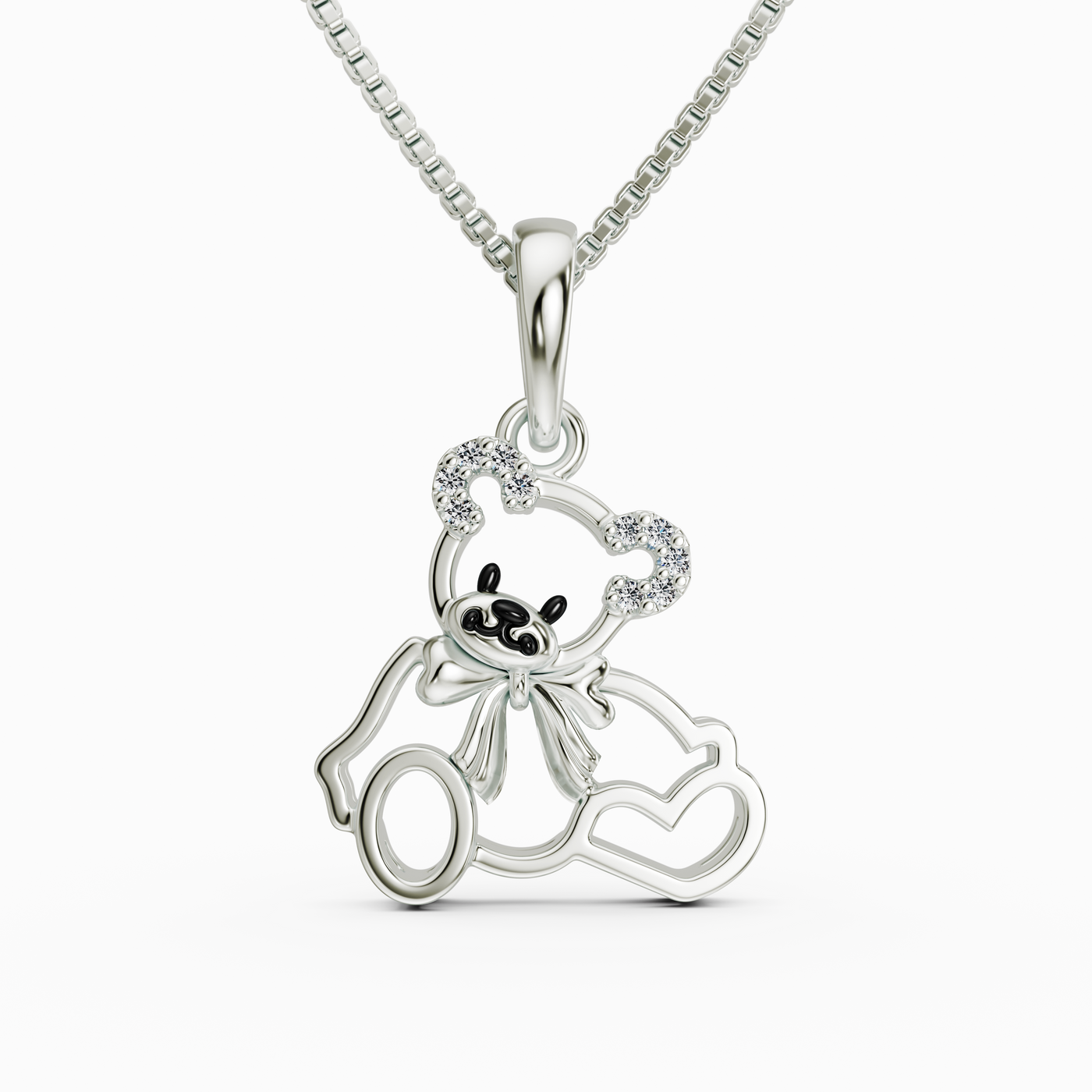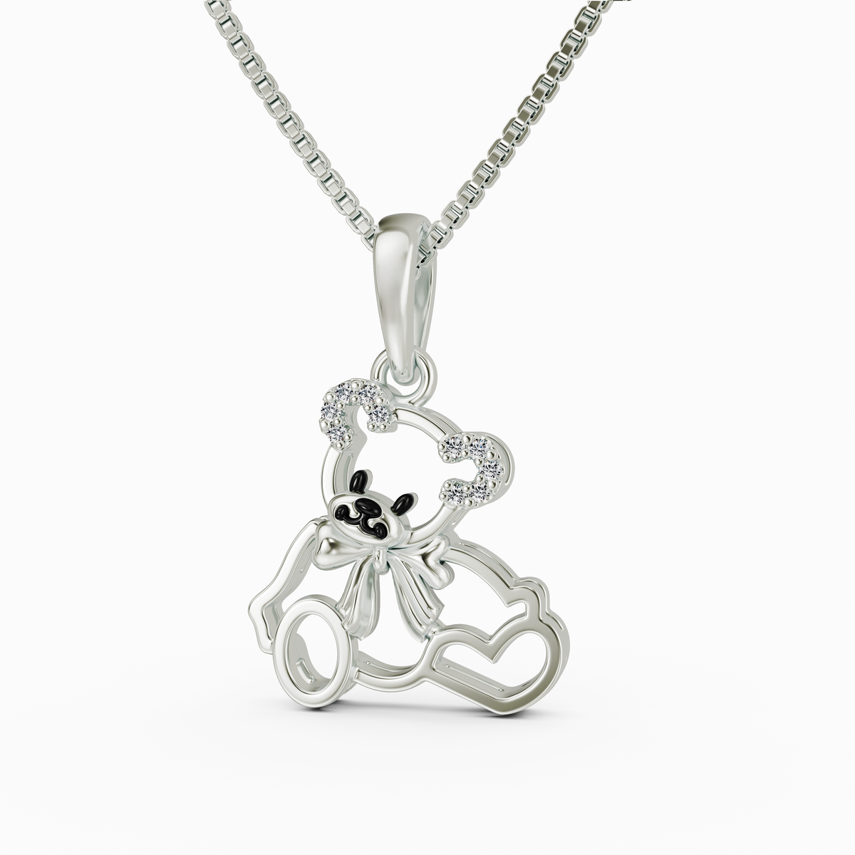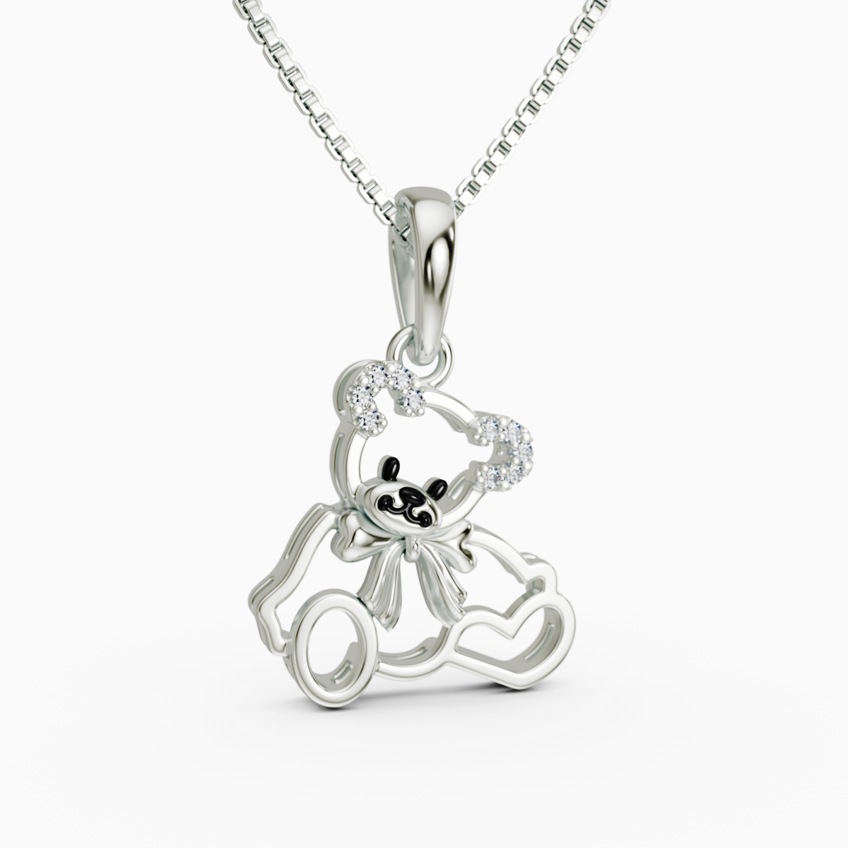 Whimsical Silhouette: The pendant features a high-polished silver bear wearing a delicate bow, alongside two interconnected heart outlines that represent a special bond.
