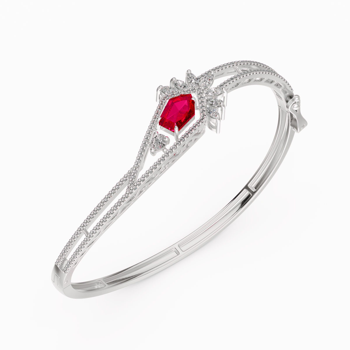 Elevate your jewelry collection with this sophisticated Geometric Red Stone Bangle. This piece features a modern, angular design that blends bold architectural shapes with delicate, nature-inspired accents. Meticulously crafted from high-polish 925 Sterling Silver, it offers a luxurious finish and lasting brilliance.